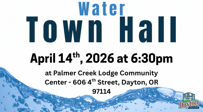 Join us to ask questions or share your concerns with the City Council about current efforts and future plans related to water in the City of Dayton. Everyone is welcome. We hope to see you there! Tuesday, April 14 6:30 p.m. Palmer Creek Lodge Community Center 606 4th St