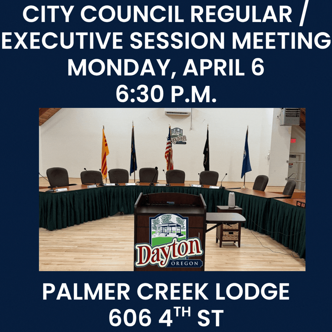 There will be a Dayton City Council Regular/Executive Session meeting Monday, April 6 at 6:30 p.m. City meetings are held upstairs in Palmer Creek Lodge Community Center located at 606 4th St. Members of the public are welcome to attend in person or via YouTube. The agenda and meeting packet may be downloaded here: https://ow.ly/Izwf50YE2Qr. The link to view the meeting online is: https://ow.ly/TRxv50YE2Qq.