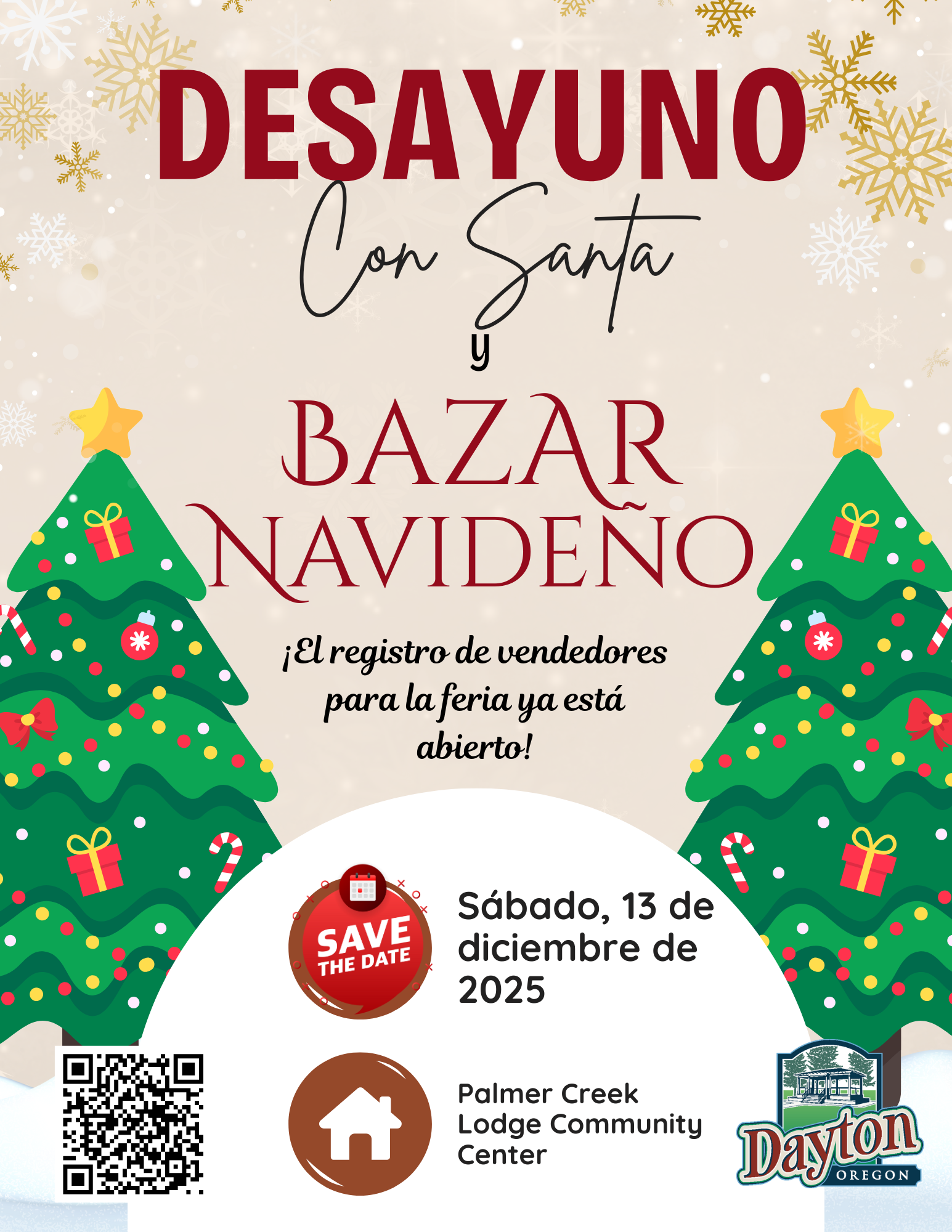El Bazar Navideño se llevará a cabo en el segundo piso del Centro de Eventos Comunitarios Palmer Creek Lodge (606 4th St en Dayton) el sábado 13 de diciembre. El Bazar estará abierto para los compradores de 9:00 a.m. a 1:00 p.m. y coincidirá con el evento Desayuno con Santa de la Ciudad, que se realizará en el primer piso de 9:00 a.m. a 12:00 p.m.