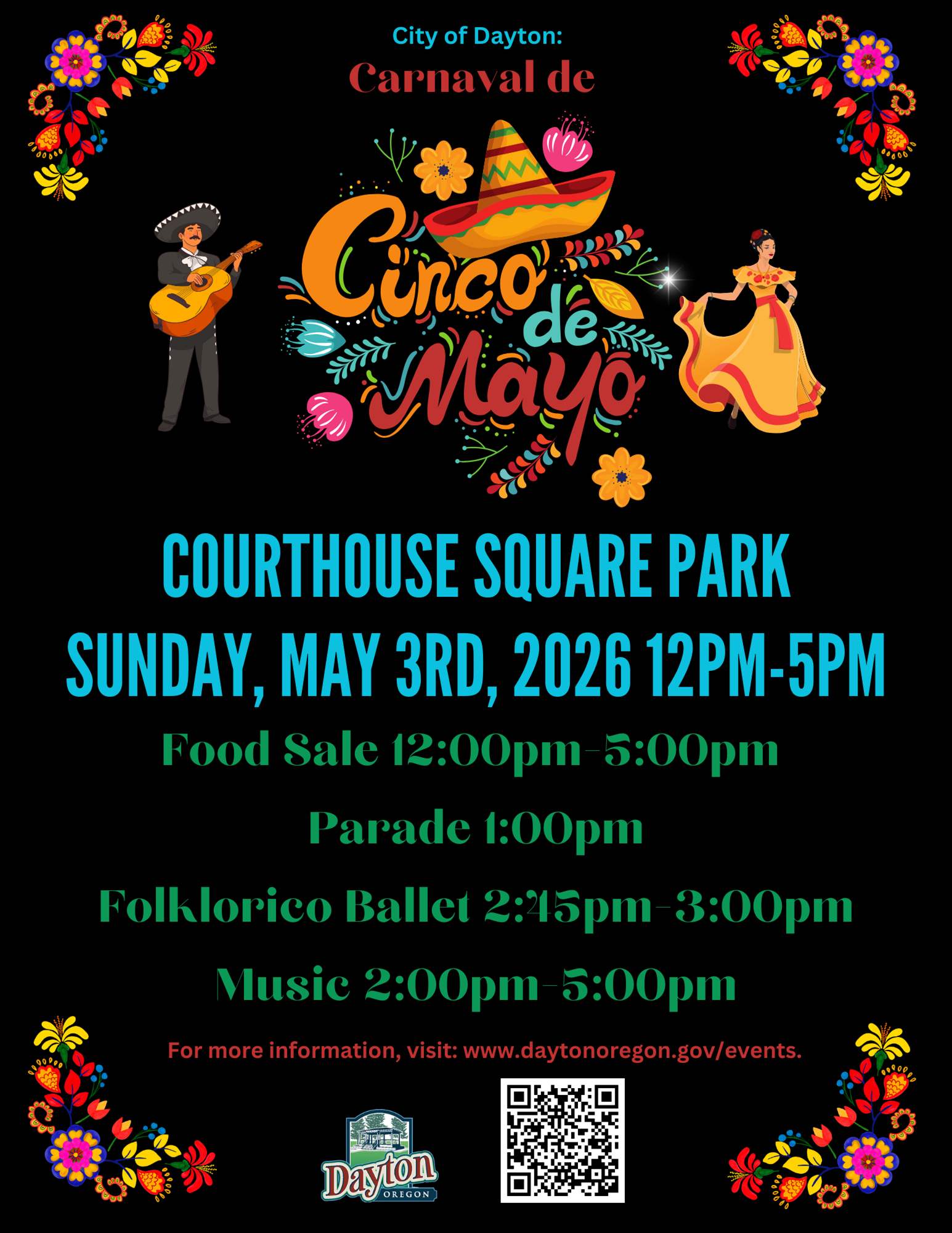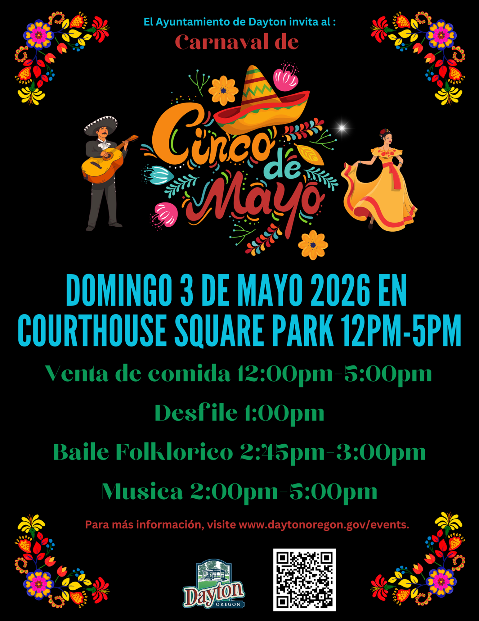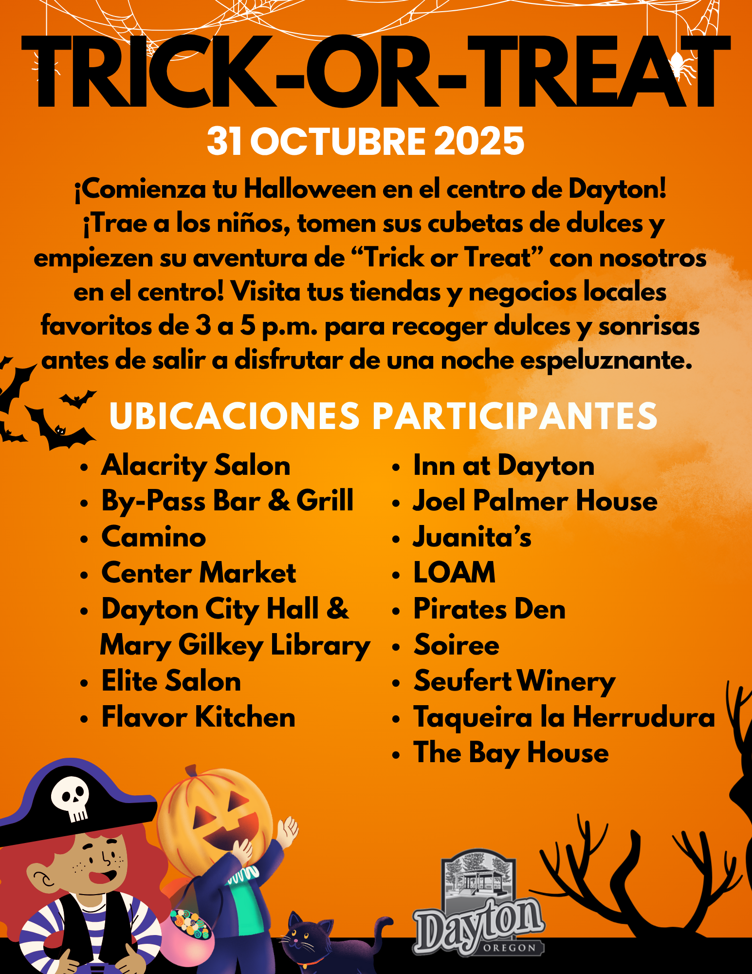 Antes de los fuegos artificiales, nuestra celebración semanal de los viernes por la noche, Dayton Friday Nights, se llevará a cabo en Courthouse Square Park de 5:30 p.m. a 8:30 p.m. con música, vendedores, degustación de vinos de Carmi Wines, y comida disponible. Además, varios restaurantes locales estarán abiertos, incluyendo Loam Kitchen, Juanita’s Café y Nevería, The By-Pass, Camino, Joel Palmer House y The Bay House.