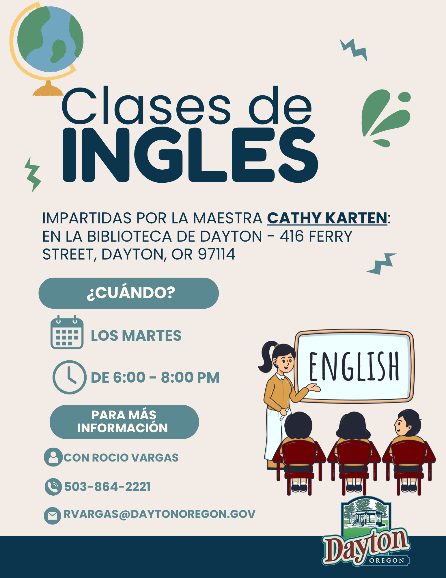Nos complace anunciar que Cathy Karten dará clases de inglés todos los jueves de 6 a 8 p.m. en la biblioteca, a un costado del Ayuntamiento. Ya sea que esté buscando mejorar sus habilidades lingüísticas o comenzar a aprender desde cero, estas clases son la oportunidad perfecta para crecer y conectarse con otras personas en un entorno de apoyo.