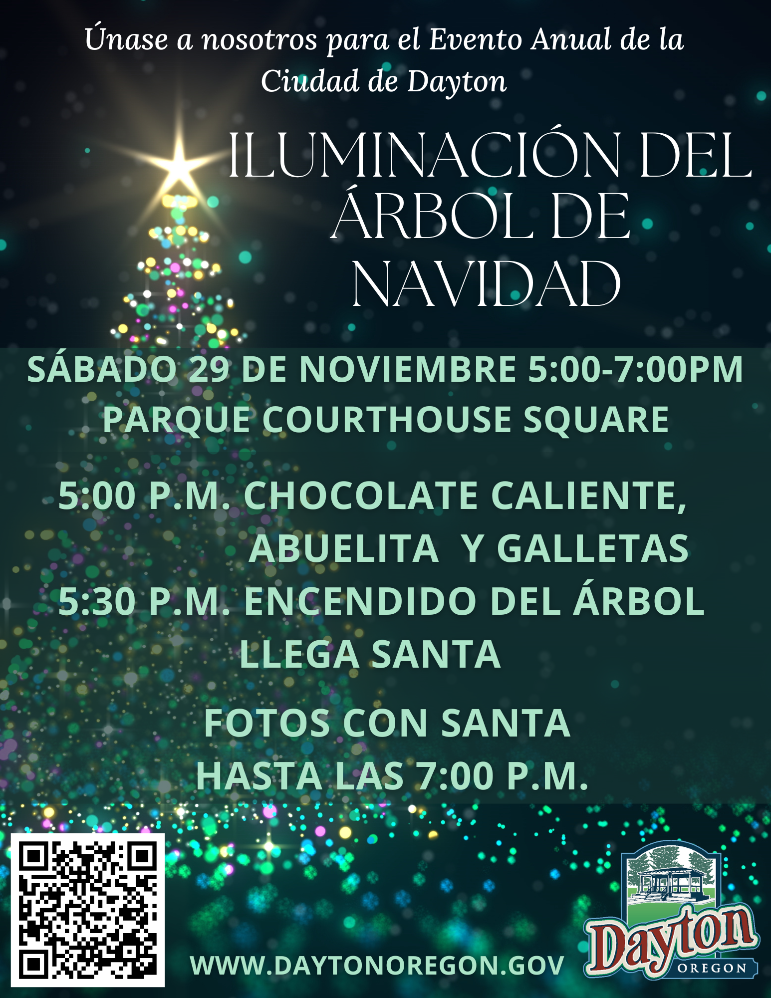 Galletas, chocolate caliente y chocolate Abuelita desde las 5 PM Encendido del árbol a las 5:30 PM Santa llega después del encendido Fotos/visitas con Santa hasta las 7 PM