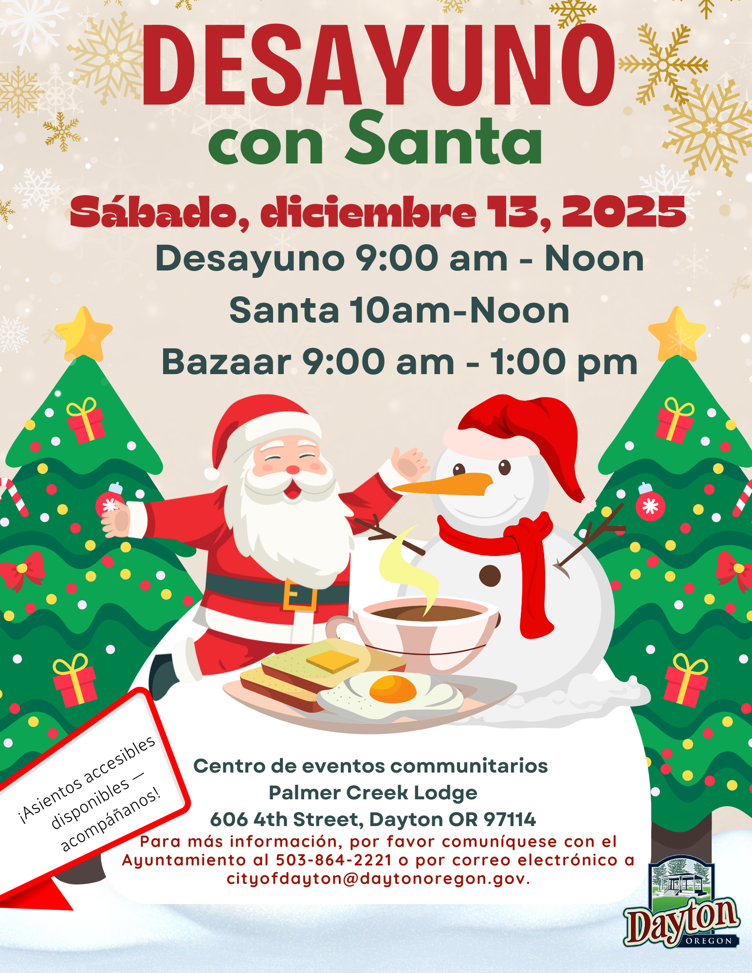Acompáñanos el sábado, 13 de diciembre en el Palmer Creek Lodge Community Events Center (606 4th St) para una mañana festiva llena de comida, diversión y espíritu navideño.