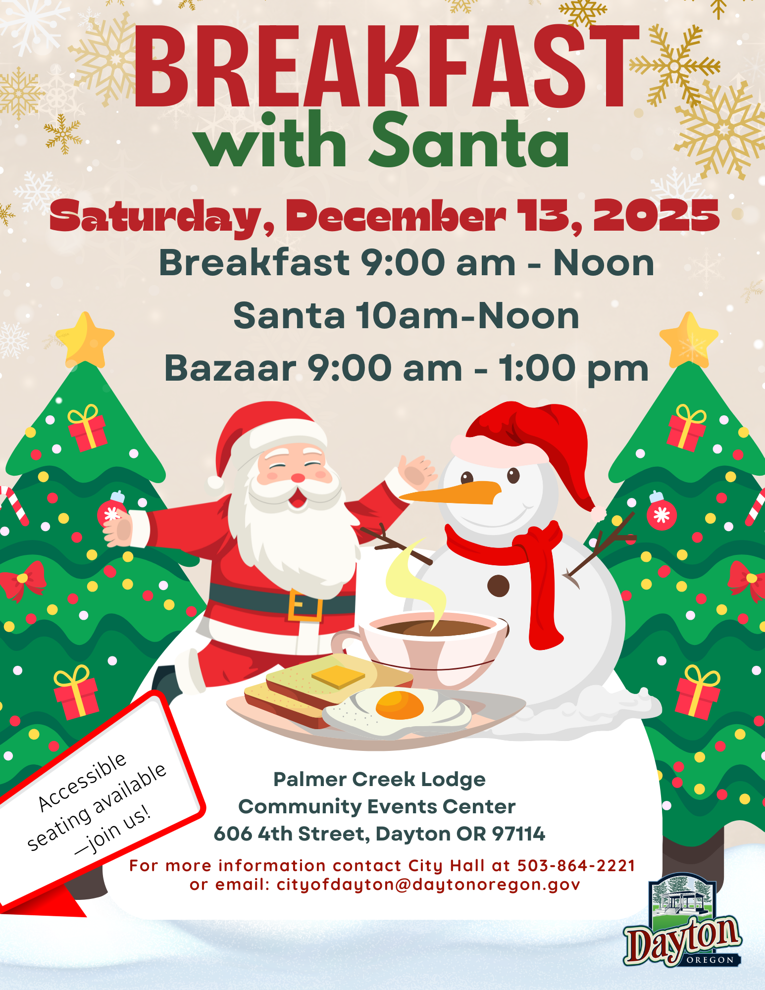 Join us on Saturday, December 13 at the Palmer Creek Lodge Community Events Center (606 4th St) for a festive morning full of food, fun, and holiday cheer!