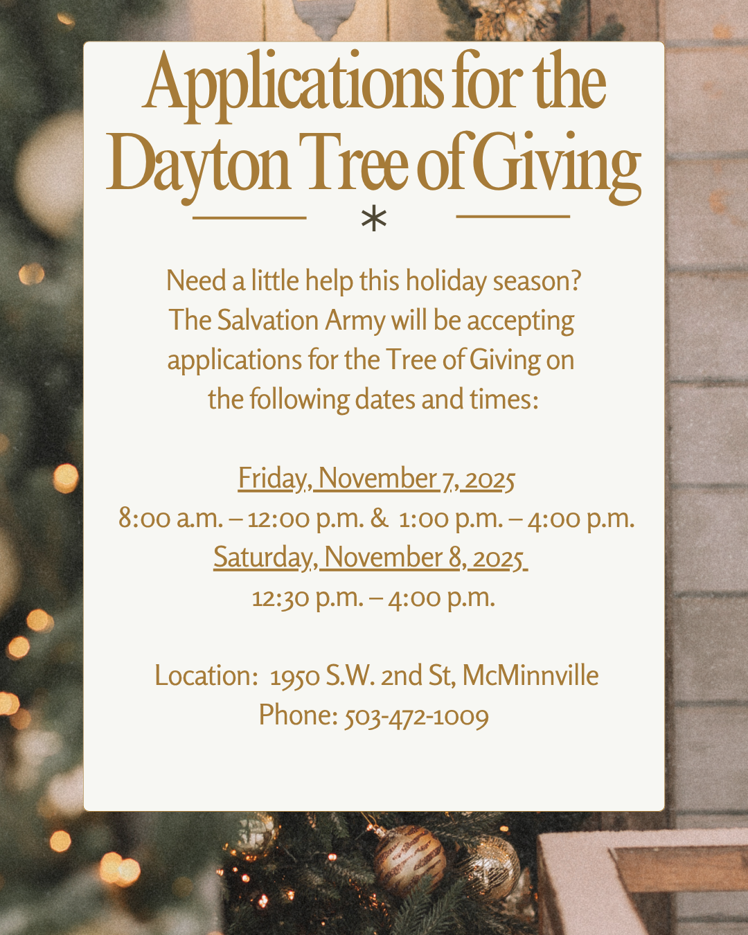 Events listed in this Section may not be sponsored by the City of Dayton. If you have an Event you would like to see posted, contact the City of Dayton at 503-864-2221. If you are interested in volunteering for an event, please click here.