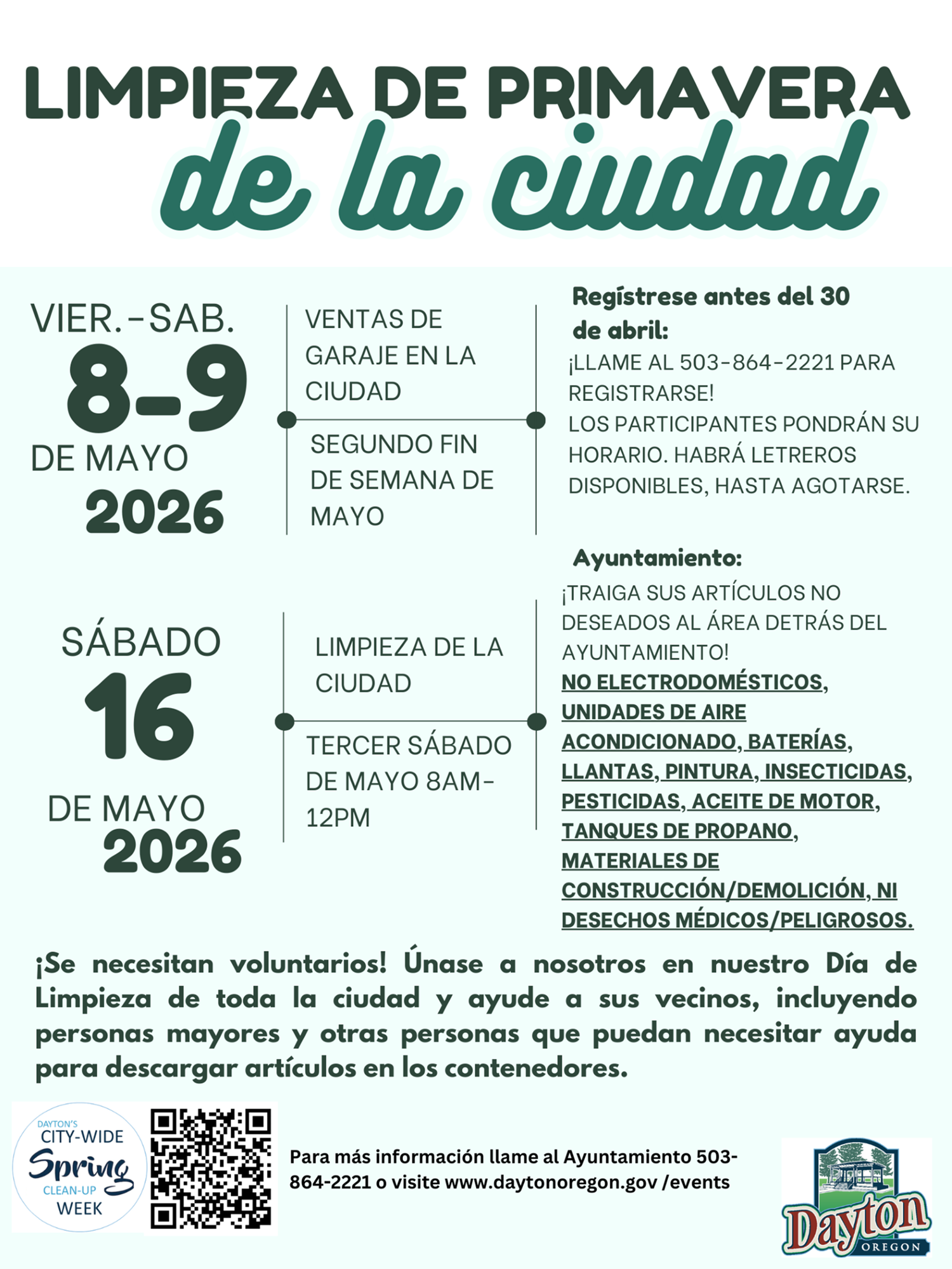 La Limpieza Comunitaria de la Ciudad será este sábado, de 8:00 a.m. a 12:00 p.m. en el lote detrás del Ayuntamiento. No podemos aceptar electrodomésticos, unidades de aire acondicionado, baterías, llantas, pintura, insecticidas o pesticidas, aceite de motor, tanques de propano, materiales de construcción o demolición, ni desechos peligrosos o médicos. Este evento es gratuito para los residentes de la Ciudad de Dayton con comprobante de domicilio y tiene un costo de $20.00 para los que no son residentes de Dayton (solo en efectivo o cheque, por favor). ¡Nos vemos el sábado!
