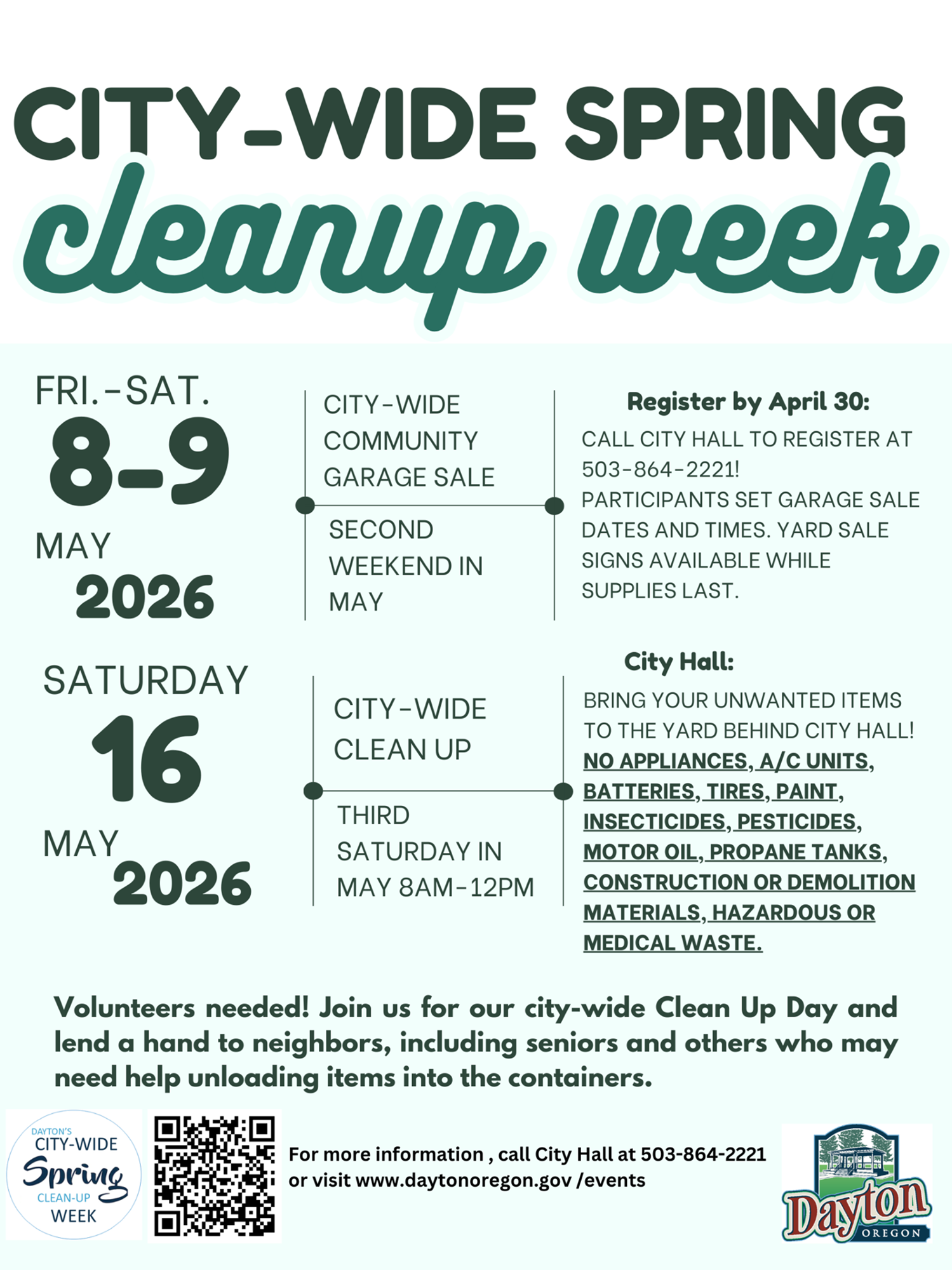 The City-Wide Cleanup is this Saturday, 8:00 a.m. - 12:00 p.m. in the lot behind City Hall. We are unable to accept appliances, A/C units, batteries, tires, paint, insecticides or pesticides, motor oil, propane tanks, construction or demolition materials, hazardous or medical waste. This event is free for residents of the City of Dayton with proof of address and is $20.00 for non-residents (cash or check only). See you Saturday!